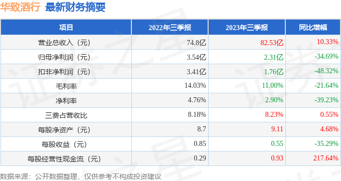 据证券之星公开数据整理,近期华致酒行(300755)发布2023年三季报。根据财报显示,本报告期中华致酒行增收不增利,债务压力上升。截至本报告期末,公司营业总收入82.53亿元,同比上升10.33%,归母净利润2.31亿元,同比下降34.69%。按单季度数据看,第三季度营业总收入23.86亿元,同比上升13.35%,第三季度归母净利润8002.99万元,同比上升144.76%。
