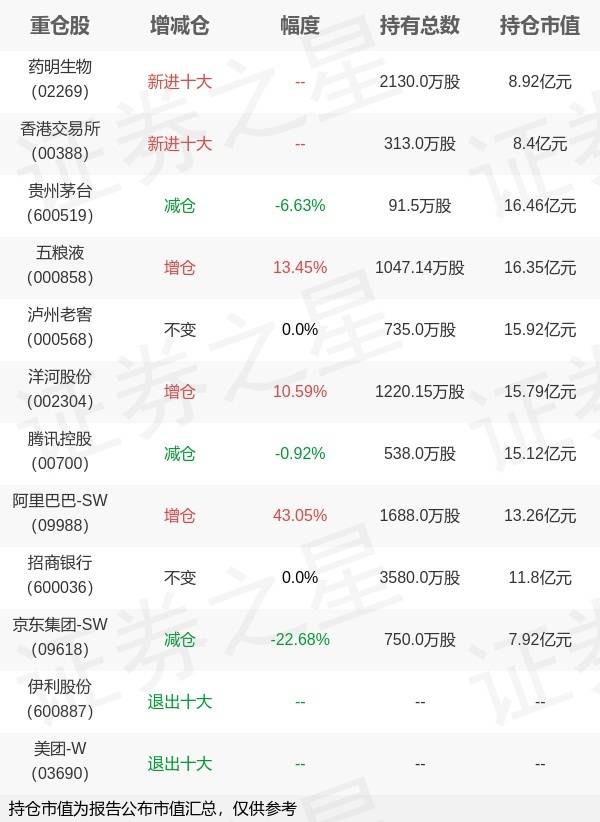 证券之星消息,10月25日易方达基金旗下张坤管理的易方达优质精选混合型基金公布三季报,近1年净值增长率7.55%。与上一季度相比,该基金前十大重仓股新增药明生物,香港交易所;其中贵州茅台持仓占比9.82%,为该基金第一大重仓股;伊利股份,美团-W等退出前十大重仓股;详细数据如下: