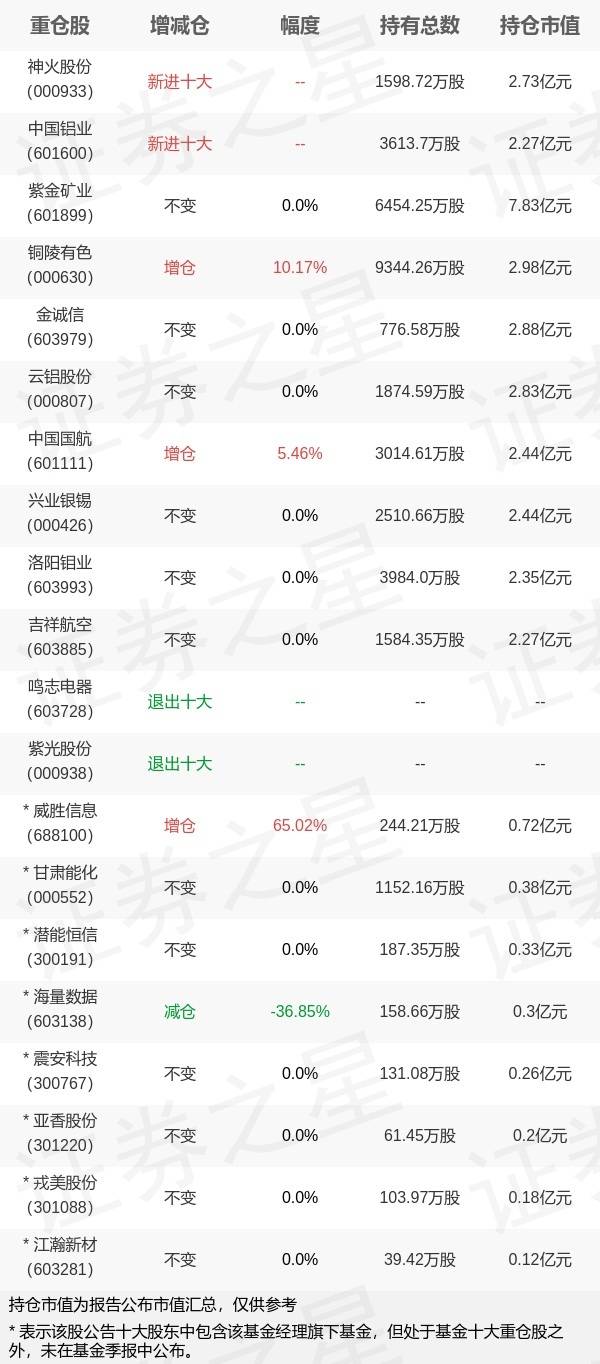 证券之星消息,10月25日华商基金旗下周海栋管理的华商新趋势优选灵活配置混合型基金公布三季报,近1年净值增长率2.06%。与上一季度相比,该基金前十大重仓股新增神火股份,中国铝业;其中紫金矿业持仓占比6.06%,为该基金第一大重仓股;鸣志电器,紫光股份等退出前十大重仓股;详细数据如下: