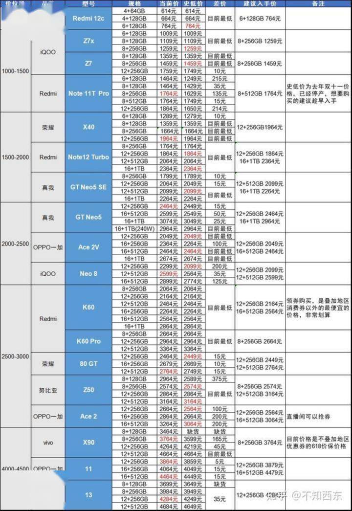 根据知乎用户@不知西东 总结的618智能手机促销情况表格,2023年618期间,不少智能手机都没有达到真正的历史最低价格。