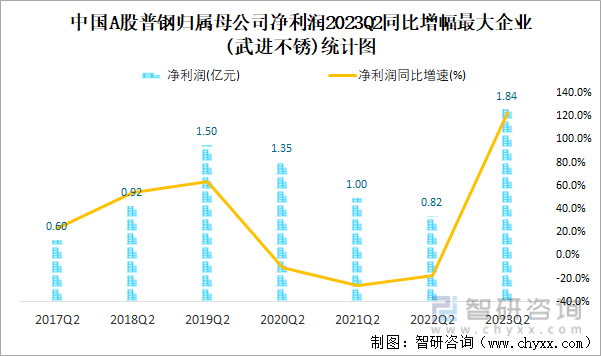 中国A股普钢归属母公司净利润2023Q2同比增幅最大企业(武进不锈)统计图