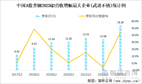 中国A股普钢2023Q2营收增幅最大企业(武进不锈)统计图