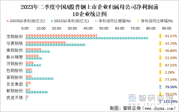 2023年二季度中国A股普钢上市公司中,宝钢股份归属母公司净利润最高,有45.52亿元,净利润排名前十的企业中8家企业同比有所下滑。普钢净利润同比增幅最大企业为武进不锈,增速为123.29%。