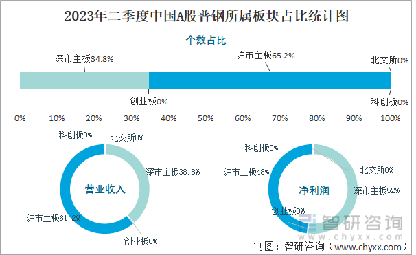 2023年二季度普钢23家上市公司以沪市主板企业数最多,占比65.2%,营收主力为沪市主板,深市主板净利润占比最多;总营收累计为9219.14亿元,按2023年9月7日14:00统计其上年同期营收减少了9.35%(统计时间有细微差异,23家企业上年二季度营收为10170.02亿元);累计归属母公司净利润为34.74亿元,11家企业净利润出现亏损,占比总企业数的47.83%。