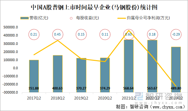 2023年二季度中国A股普钢上市公司中,截至2023年9月7日14:00,1994年1月6日上市的马钢股份上市时间最早距今约29年,从近几年二季度营收与净利润来看,2021Q2营收最高,有568.64亿元,2023Q2归属母公司净利润亏损。