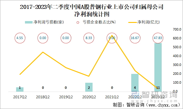 2017-2023年二季度中国A股普钢行业上市公司归属母公司净利润统计图