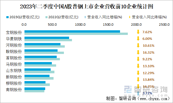 2023年二季度中国A股普钢上市企业营收前10企业统计图