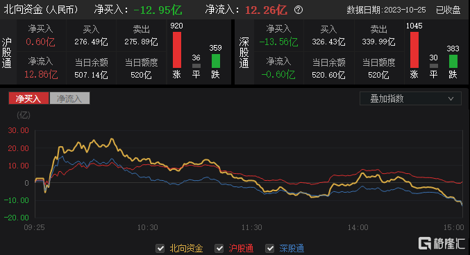 今日,北上资金净卖出12.95亿元,其中沪股通净买入0.6亿元,净流入12.86亿元;深股通净卖出13.56亿元,净流出0.6亿元。
