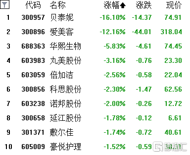 美容护理板块重挫,贝泰妮跌超16%,爱美客跌超12%,华熙生物、科思股份、等跟跌。
