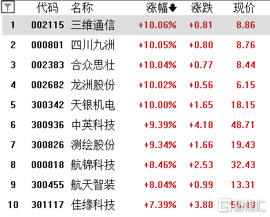 卫星互联网板块表现活跃,三维通信、四川九州、合众思壮、龙洲股份、天银机电涨停,中英科技、测绘股份涨超9%。