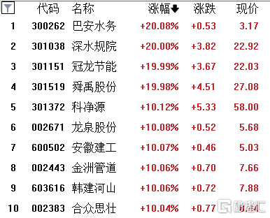 水利、基建股掀涨停潮,巴安水务、深水规院、冠龙节能、安徽建工、舜宇股份等近20股涨停。