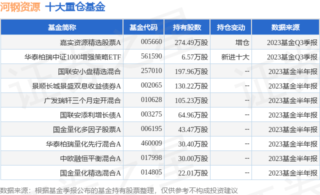 根据2023基金Q3季报公募基金重仓股数据,重仓该股的公募基金共2家,其中持有数量最多的公募基金为嘉实资源精选股票A。嘉实资源精选股票A目前规模为4.56亿元,最新净值2.3573(10月24日),较上一交易日上涨1.5%,近一年下跌4.69%。该公募基金现任基金经理为苏文杰。苏文杰在任的基金产品包括:嘉实碳中和主题混合A,管理时间为2023年3月31日至今,期间收益率为-9.71%。