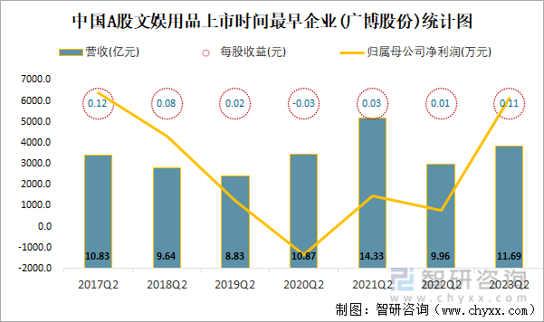 2023年二季度中国A股文娱用品上市公司中,截至2023年9月7日14:00,2007年1月10日上市的广博股份上市时间最早距今约16年,从近几年二季度营收与净利润来看,2021Q2营收最高,有14.33亿元,2020Q2归属母公司净利润亏损。