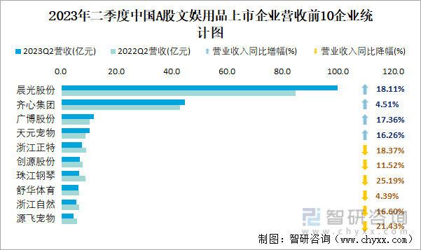 2023年二季度中国A股文娱用品上市公司中,晨光股份营收最多,有99.61亿元,营收排名前十的企业有6家营收同比有所下滑。文娱用品营收同比增幅最高的企业为华立科技,增速40.51%达到3.61亿元。
