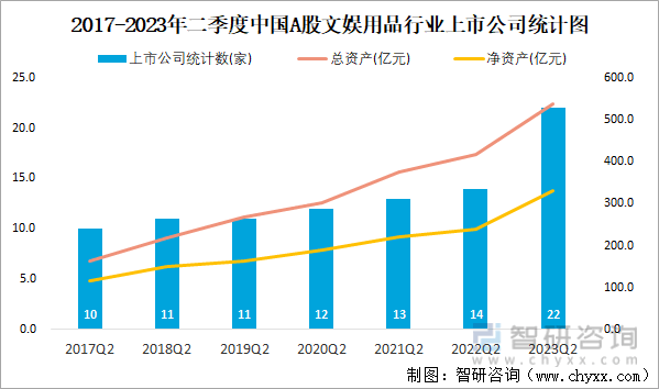 2017-2023年二季度中国A股文娱用品行业上市公司统计图