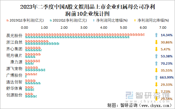 2023年二季度中国A股文娱用品上市公司中,晨光股份归属母公司净利润最高,有6.04亿元,净利润增速为14.34%,净利润排名前十的企业中6家企业同比有所下滑。文娱用品净利润同比增幅最大企业为群兴玩具,增速为825.24%。