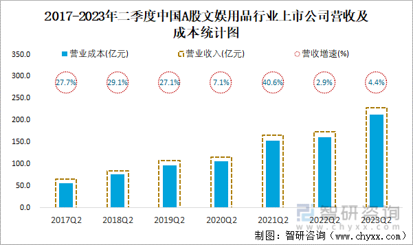 2017-2023年二季度中国A股文娱用品行业上市公司营收及成本统计图
