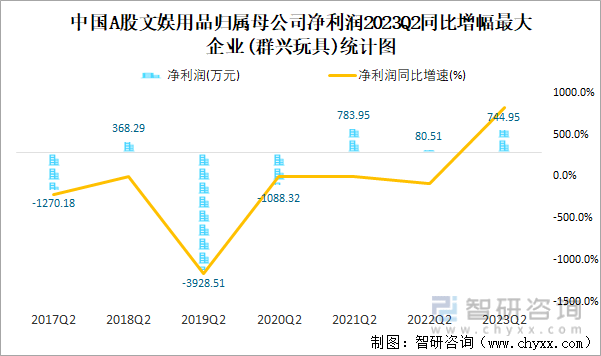 中国A股文娱用品归属母公司净利润2023Q2同比增幅最大企业(群兴玩具)统计图