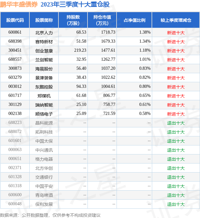 根据2023基金Q3季报公募基金重仓股数据,重仓该股的公募基金共7家,其中持有数量最多的公募基金为鹏华丰盛债券。鹏华丰盛债券目前规模为12.49亿元,最新净值1.048(10月24日),较上一交易日上涨0.38%,近一年下跌5.33%。该公募基金现任基金经理为范晶伟 汤志彦。汤志彦在任的基金产品包括:鹏华弘嘉混合A,管理时间为2017年12月14日至今,期间收益率为102.17%;鹏华尊惠定期开放混合A,管理时间为2018年10月27日至今,期间收益率为82.25%;鹏华安和混合A,管理时间为2020年6月17日至今,期间收益率为19.67%;鹏华安庆混合A,管理时间为2020年6月23日至今,期间收益率为20.16%。范晶伟在任的基金产品包括:鹏华金城混合,管理时间为2021年8月7日至今,期间收益率为-2.04%;鹏华弘泰A,管理时间为2021年8月24日至今,期间收益率为-0.13%;鹏华稳健恒利债券A,管理时间为2023年1月18日至今,期间收益率为-0.61%。