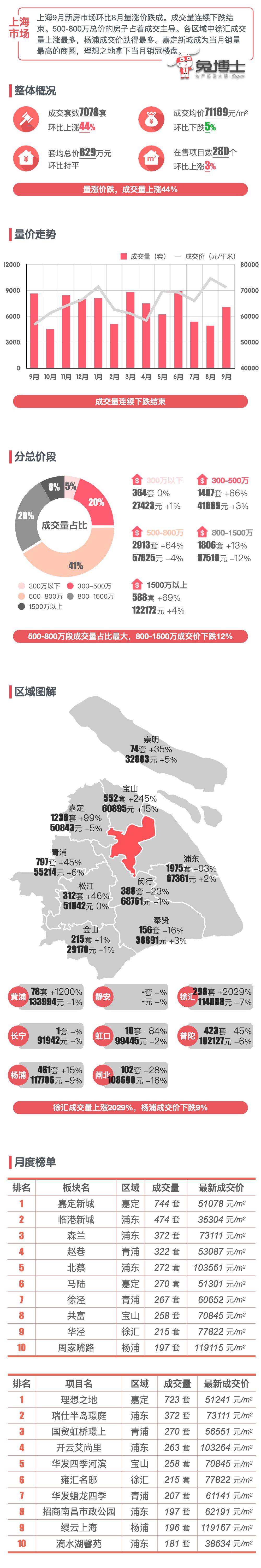 结语:上海9月新房市场环比8月量涨价跌成。成交量连续下跌结束。500-800万总价的房子占着成交主导。各区域中徐汇成交量上涨最多,杨浦成交价跌得最多。嘉定新城成为当月销量最高的商圈,理想之地拿下当月销冠楼盘。