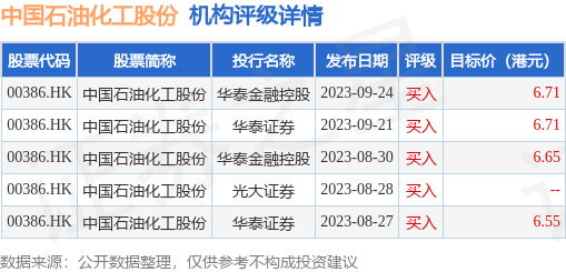 截至2023年10月25日收盘,中国石油化工股份(00386.HK)报收于4.0港元,下跌1.48%,换手率0.39%,成交量9672.84万股,成交额3.91亿港元。投行对该股的评级以买入为主,近90天内共有5家投行给出买入评级,近90天的目标均价为6.66港元。华泰金融控股最新一份研报给予中国石油化工股份买入评级,目标价6.71港元。