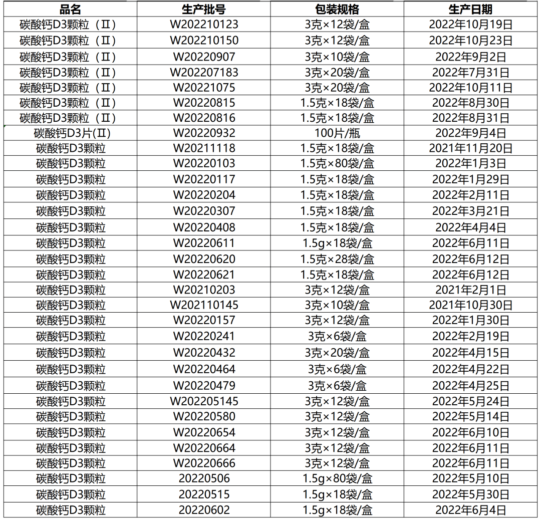 上述32批次的产品,包括24批次的碳酸钙D3颗粒、7批次的碳酸钙D3颗粒(Ⅱ),以及1批次的碳酸钙D3片(Ⅱ)。