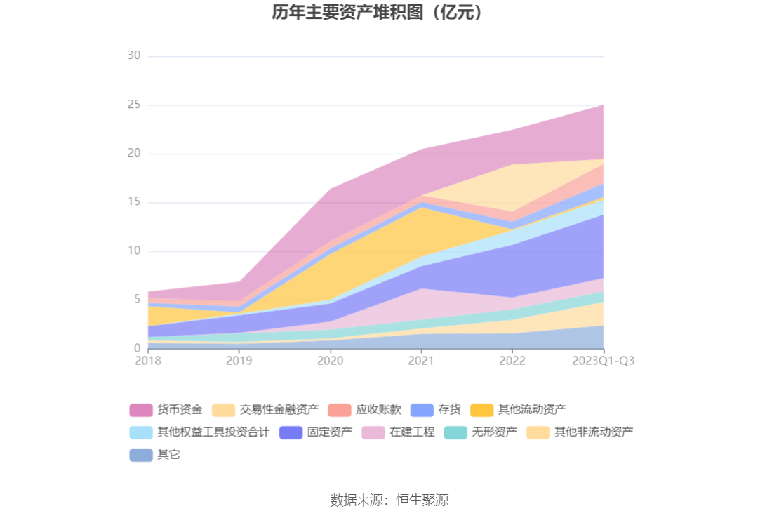 资产重大变化方面,截至2023年三季度末,公司交易性金融资产较上年末减少89.61%,占公司总资产比重下降19.47个百分点;货币资金较上年末增加56.90%,占公司总资产比重上升6.45个百分点;应收账款较上年末增加92.20%,占公司总资产比重上升3.34个百分点;其他非流动资产较上年末增加69.92%,占公司总资产比重上升3.26个百分点。