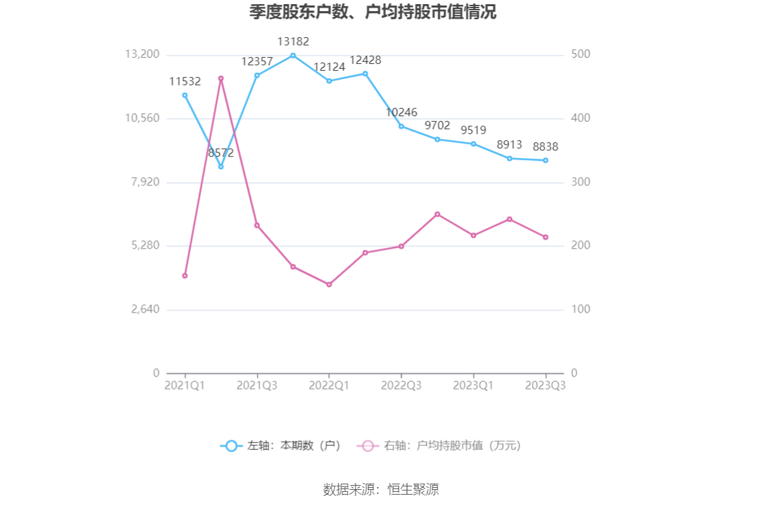 筹码集中度方面,截至2023年三季度末,公司股东总户数为8838户,较上半年末下降了75户,降幅0.84%;户均持股市值由上半年末的242.30万元下降至214.17万元,降幅为11.61%。