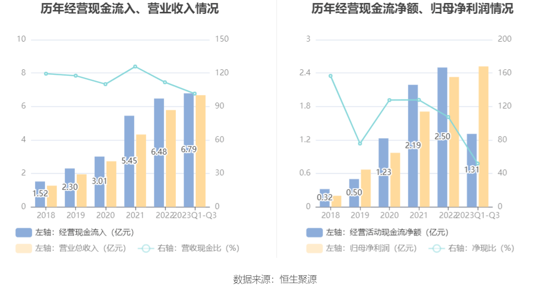 2023年前三季度,公司营业收入现金比为101.61%,净现比为51.90%。