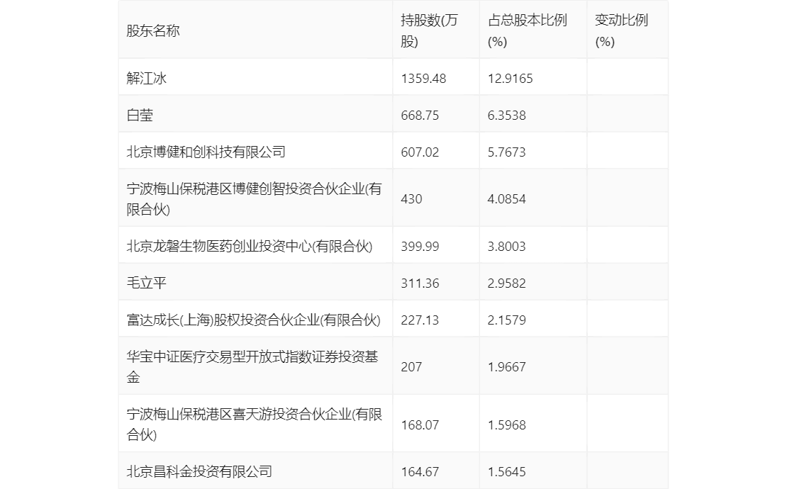 三季报显示,2023年三季度末公司十大流通股东中,新进股东为解江冰、白莹、北京博健和创科技有限公司、宁波梅山保税港区博健创智投资合伙企业(有限合伙)、毛立平、宁波梅山保税港区喜天游投资合伙企业(有限合伙),取代了上半年末的易方达医疗保健行业混合型证券投资基金、上海诺毅投资管理有限公司、冯志浩、中欧医疗健康混合型证券投资基金、交银施罗德阿尔法核心混合型证券投资基金、冯建。在具体持股比例上,华宝中证医疗交易型开放式指数证券投资基金持股有所上升,北京龙磐生物医药创业投资中心(有限合伙)、富达成长(上海)股权投资合伙企业(有限合伙)、北京昌科金投资有限公司持股有所下降。