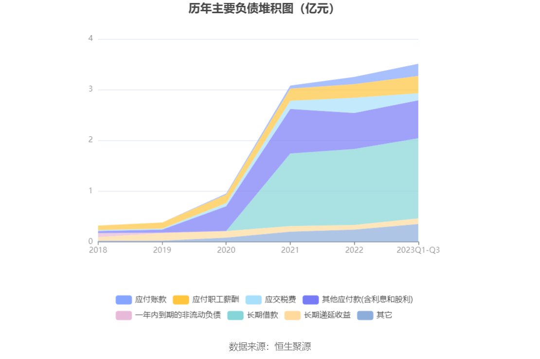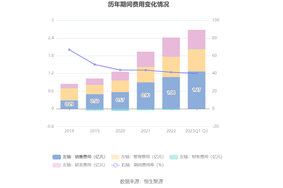 2023年前三季度,公司期间费用为2.68亿元,较上年同期增加1.13亿元;期间费用率为40.12%,较上年同期上升4.97个百分点。其中,销售费用同比增长90.78%,管理费用同比增长59.1%,研发费用同比增长47.95%,财务费用由去年同期的-252.72万元变为97.98万元。