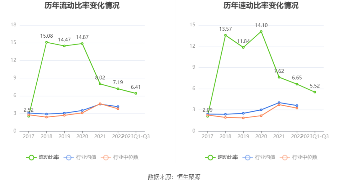 2023年前三季度,公司流动比率为6.41,速动比率为5.52。