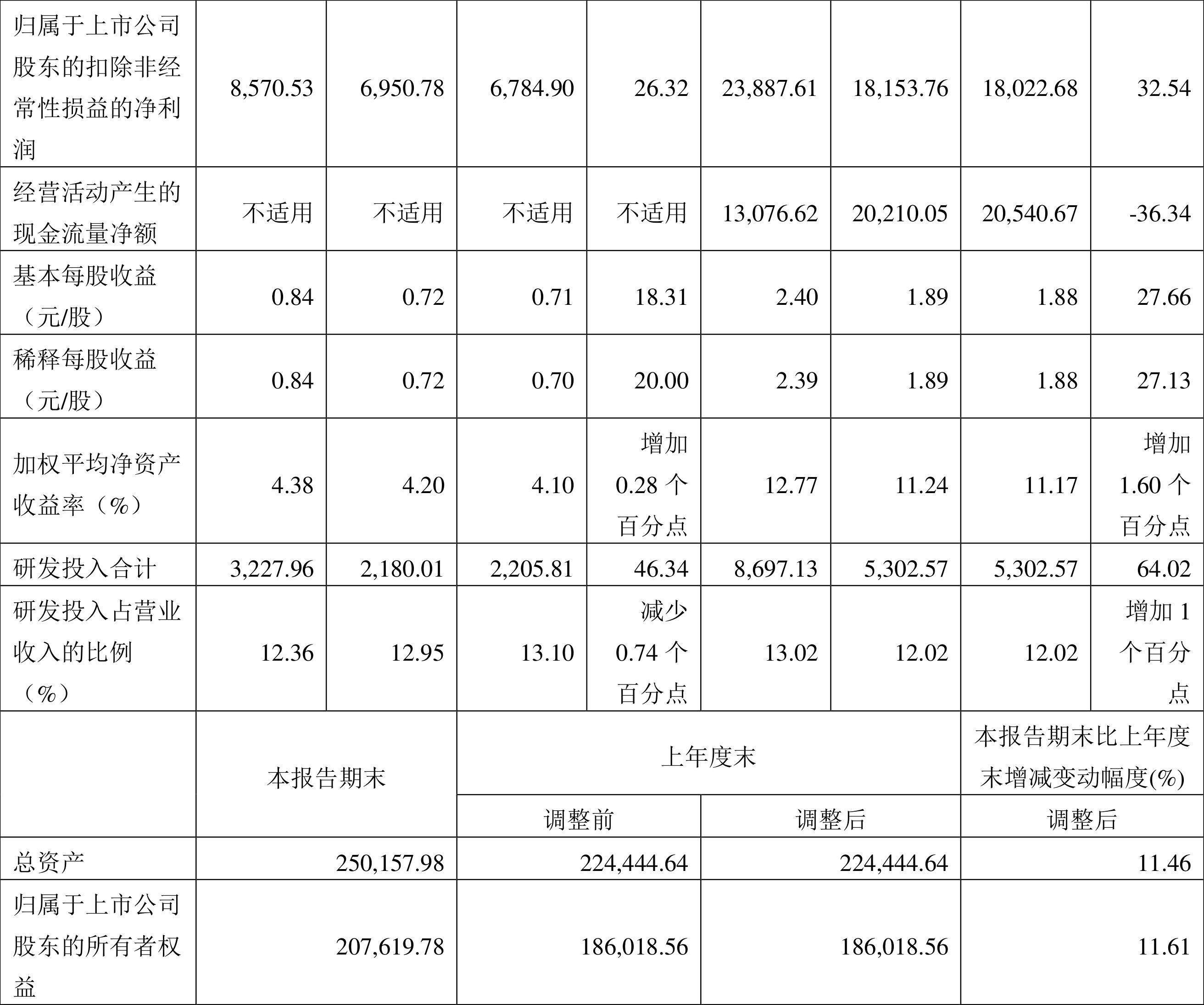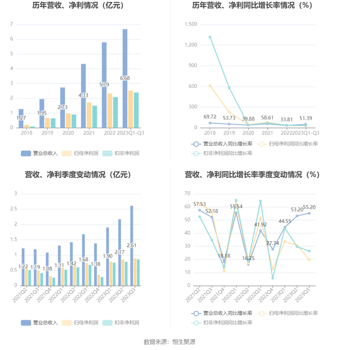 根据三季报,公司第三季度实现营业总收入2.61亿元,同比增长55.20%,环比增长20.36%;归母净利润8878.88万元,同比增长19.70%,环比增长4.72%;扣非净利润8570.53万元,同比增长26.32%,环比增长9.79%。