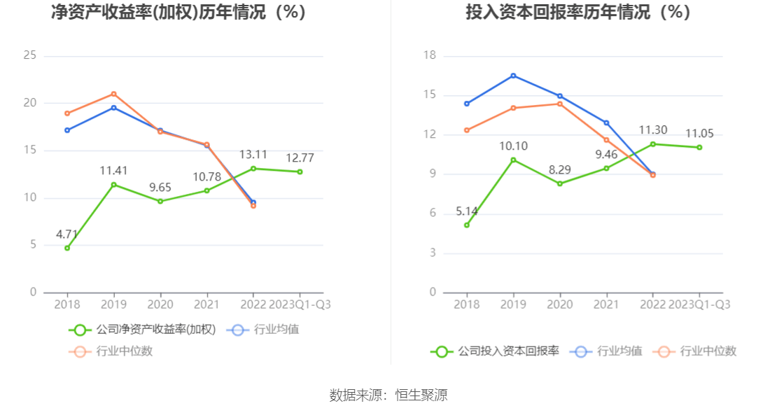 数据显示,2023年前三季度公司加权平均净资产收益率为12.77%,较上年同期增长1.60个百分点;公司2023年前三季度投入资本回报率为11.05%,较上年同期增长1.45个百分点。