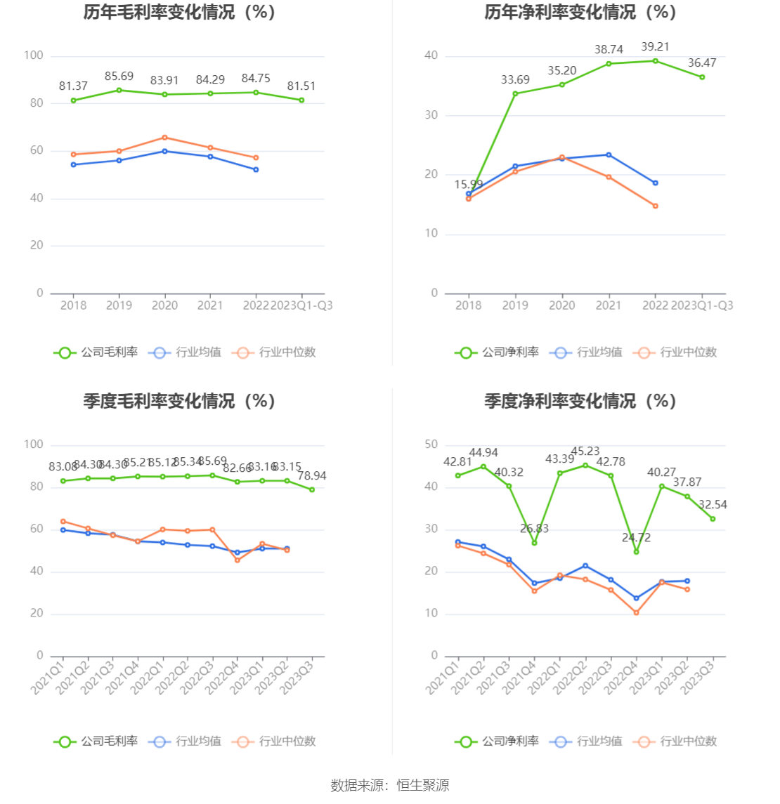 2023年前三季度,公司毛利率为81.51%,同比下降3.90个百分点;净利率为36.47%,较上年同期下降7.28个百分点。从单季度指标来看,2023年第三季度公司毛利率为78.94%,同比下降6.75个百分点,环比下降4.21个百分点;净利率为32.54%,较上年同期下降10.24个百分点,较上一季度下降5.33个百分点。