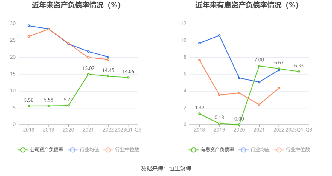 在偿债能力方面,公司2023年三季度末资产负债率为14.05%,相比上年末下降0.40个百分点;有息资产负债率为6.33%,相比上年末下降0.34个百分点。