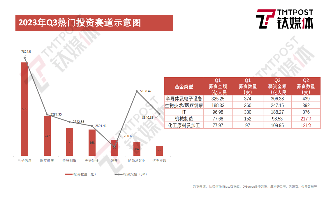 在2023年上半年,Top五热门投资赛道分别为,半导体及电子设备、医疗健康、IT、机械制造、化工原料及加工。
