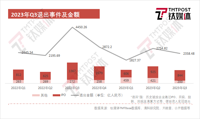 据不完全统计,2023年第三季度国内VC/PE市场退出事件共计979起案例,值得一提的是,IPO仍是主要的退出方式,通过IPO推出的事件数量为844起,相比于Q2下降8.8%,同比更为明显,下降38.2%。