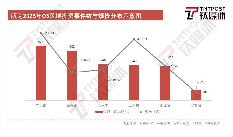 相较2023年第二季度而言,第三季度整体投资总金额略有下降,投资总额减少113.41亿元,降幅为4.55%,但获得投资事件数较2023年二季度减少939家,降幅达13%,较去年同期减少4216家,下降40.1%。