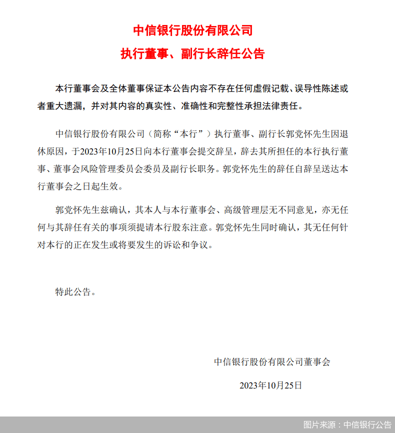 北京商报讯(记者 宋亦桐)10月25日,中信银行发布《执行董事、副行长辞任公告》表示,该行执行董事、副行长郭党怀因退休原因,于2023年10月25日向该行董事会提交辞呈,辞去其所担任的中信银行执行董事、董事会风险管理委员会委员及副行长职务。郭党怀的辞任自辞呈送达该行董事会之日起生效。
