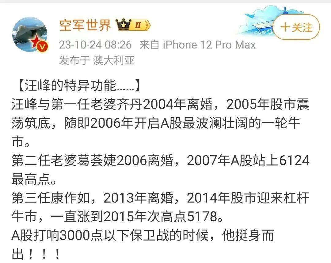 但很快就有人总结发现,汪峰前三次离婚后,都成功启动了近20年最大的两次牛市,这一次筑底有望,反攻在即。