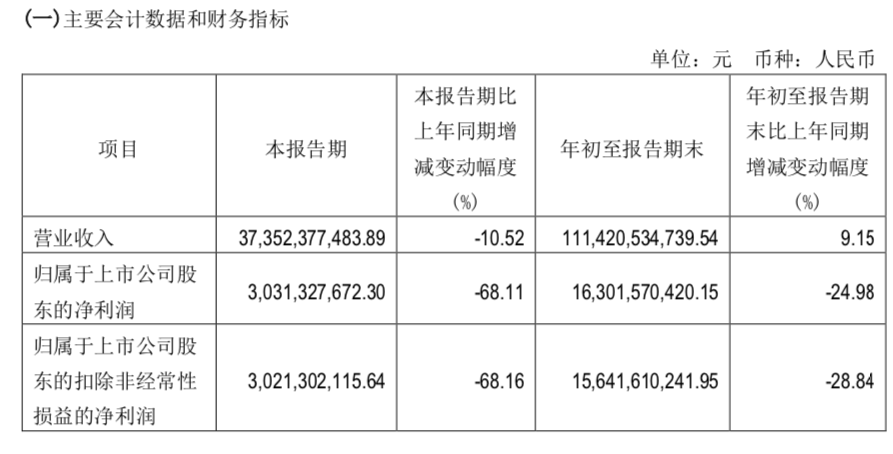 10月25日,光伏板块龙头通威股份(600438.SH)发布2023年三季度财报,公司前三季度实现营业收入1114.21亿元,同比增长9.15%;实现归母净利润163.02亿元,同比下降24.98%。其中,第三季度营业收入373.52亿元,同比下滑10.52%;实现归母净利润30.31亿元,同比下滑68.11%。
