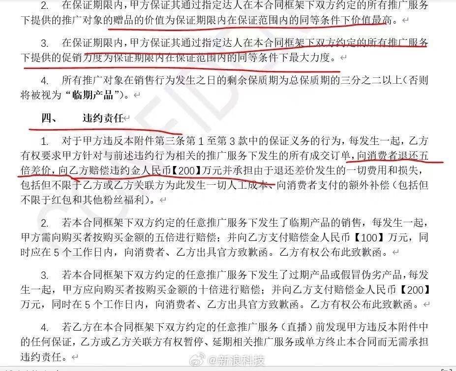 10月25日消息,由京东采销人员朋友圈掀起的「李佳琦二选一」事件又有新的进展。 据新浪科技独家获取到的一份「美ONE直播推广服务合同」显示,品牌需要保证其通过指定达人在本合同框架下双方约定的所有推广服务下提供的促销力度为保证期限内在保证范围内的同等条件下最大力度。如若违约,品牌需要向消费者退还五倍差价,并向美ONE赔偿违约金人民币200万元,并承担由于退还差价发生的一切费用和损失。