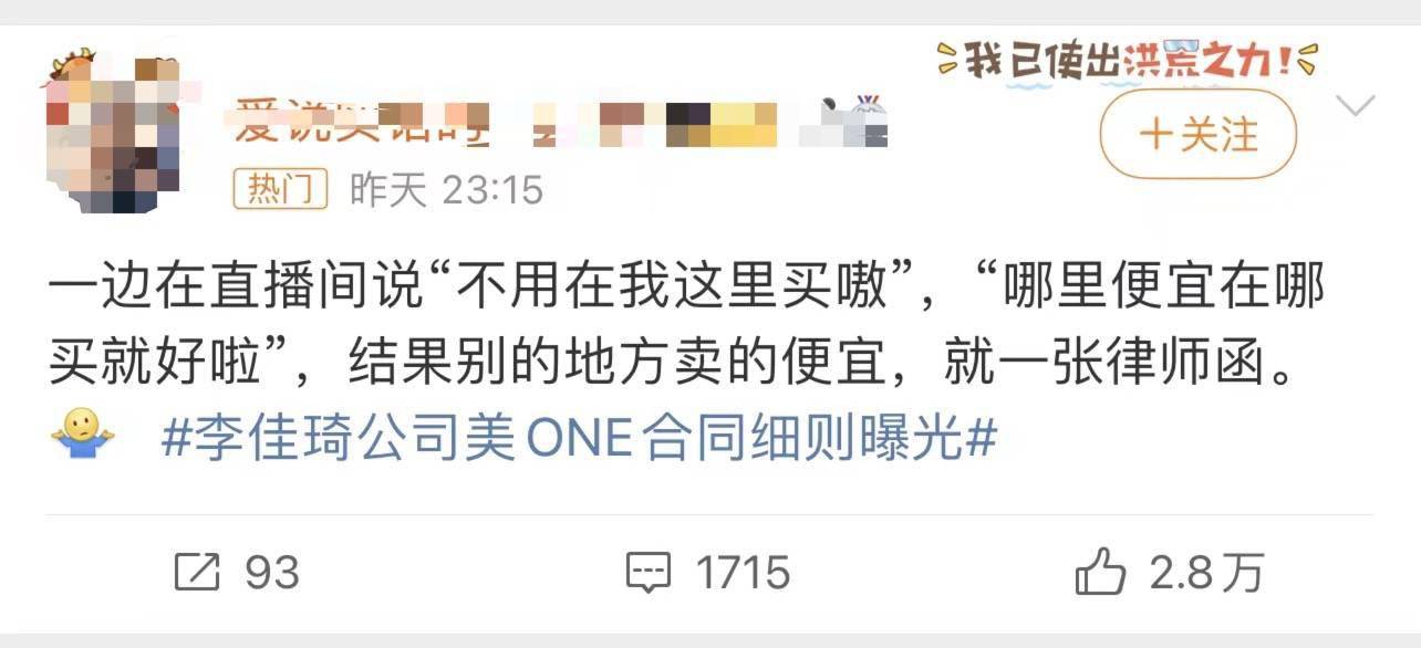 另有博主发文称,一边在直播间说“不用在我这里买嗷,哪里便宜在哪里买就好啦”,结果别的地方卖的便宜,就一张律师函。