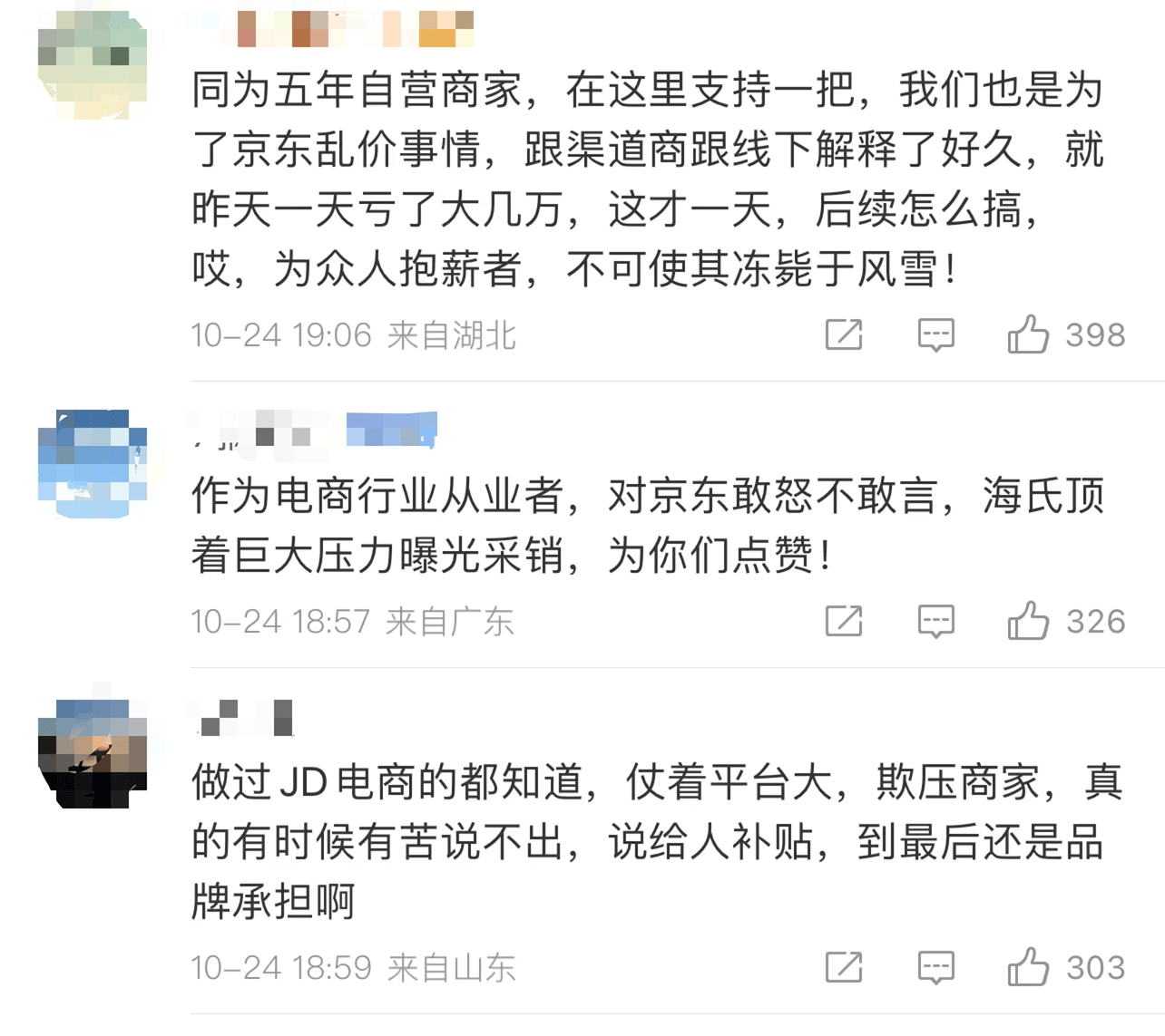 在海氏官博声明下方,有不少商家大倒苦水称,平台「店大欺客」擅自改价,表面是说平台补贴,实际最后仍然是品牌方承担。