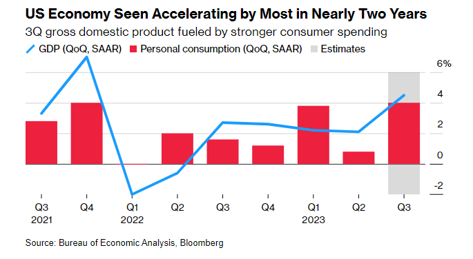 在周四美国政府数据公布之前,外媒对经济学家进行的一项调查显示,预计上季度美国GDP的年化增长率为4.5%,是第二季度的两倍多。这将是自2021年底以来的最快增速,当时经济正在摆脱疫情的影响。