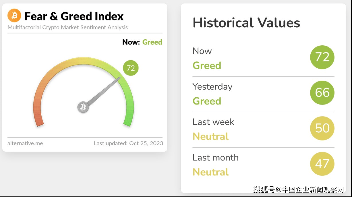 中国区块链网讯:根据加密货币恐惧与贪婪指数,市场情绪已恢复至 2021 年 11 月中旬其价格达到 69,000 美元以来的最高水平。该指数目前为 72 分(满分 100 分),处于“贪婪”排名之列——较 10 月 24 日上升 6 分,较 10 月 50 分的“中性”排名上升 16 分. 18.