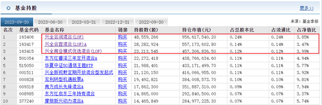 根据东方财富网数据,截至9月30日,持有工业富联前10的基金中,兴全合润混合(LOF)、兴全合宜混合(LOF)A、兴全商业模式优选混合(LOF)分别持股4855.9万股、2828.3万股、2321.3万股。