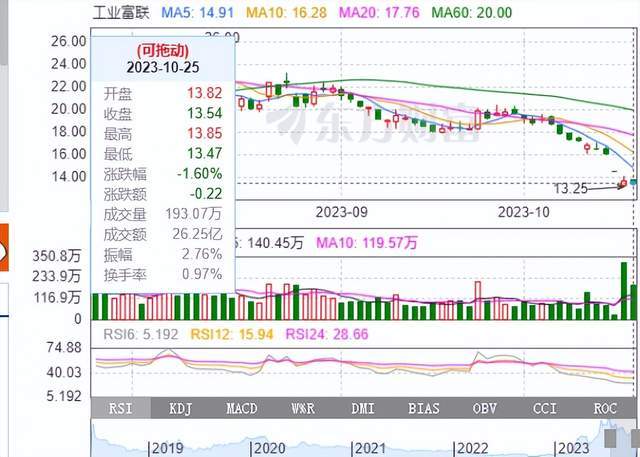 如今,随着富士康被查,工业富联的股价更加震荡了。截至10月25日收盘,该股继续小幅下挫,收报13.54元/股,较前一交易日下跌1.6%。三个交易日市值蒸发200亿元,最新总市值为2690亿元。