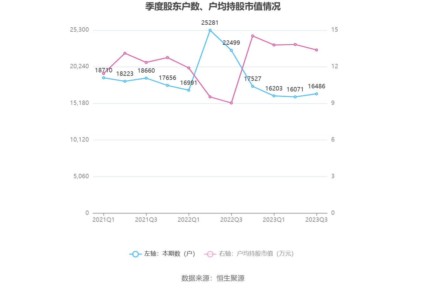筹码集中度方面,截至2023年三季度末,公司股东总户数为1.65万户,较上半年末增长了415户,增幅2.58%;户均持股市值由上半年末的13.82万元下降至13.37万元,降幅为3.26%。